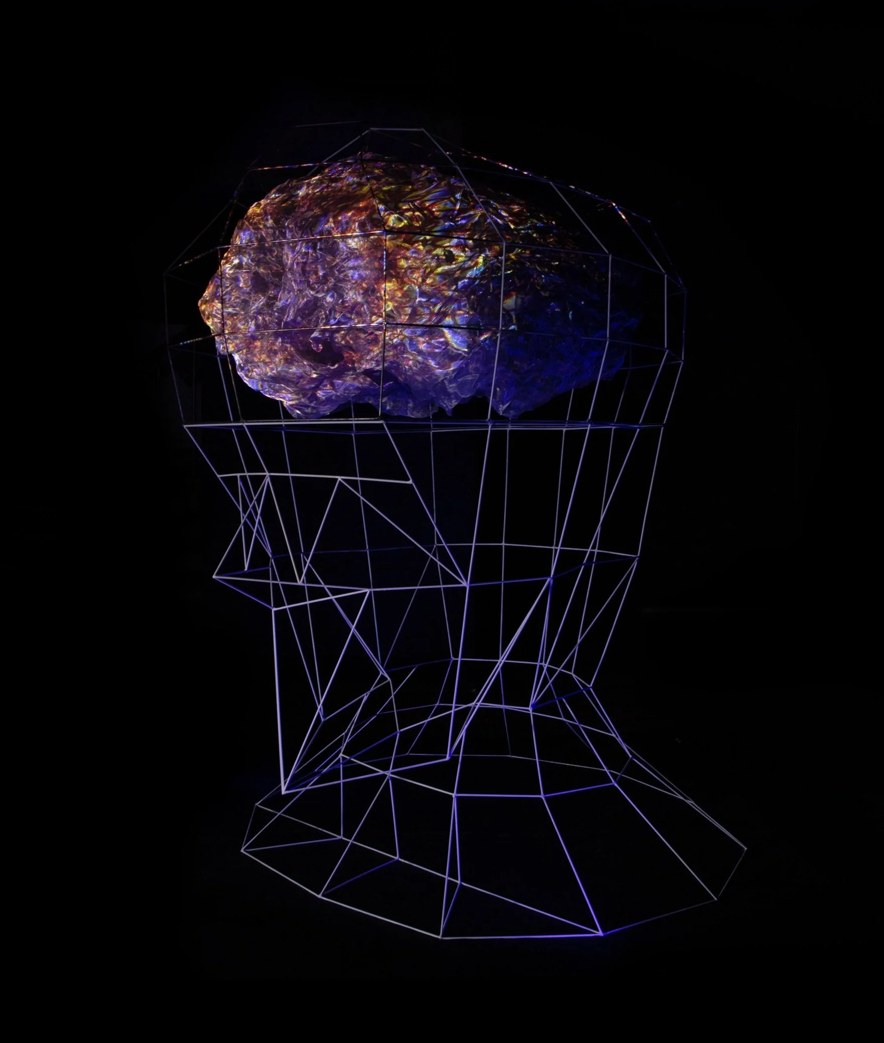 Grey Matter My MFA Thesis Project - a 11-foot-tall sculpture of a human head, forged from metal and thought, serving as a striking metaphor for the industrial and the intellectual, the material and the ethereal. Within this metallic structure, a brain pulses with sound-reactive projections, creating a visual symphony that captures the profound impact of auditory stimuli on human consciousness. This interactive immersive technology installation combines high-end techniques such as projection mapping, audio-reactive generative GPU particle systems, and interactive elements. It reacts dynamically to both its internal music and the soundscapes of its surrounding environment, crafting an experience that transcends the sum of its parts while illuminating the invisible threads that connect sound, light, and human perception.
