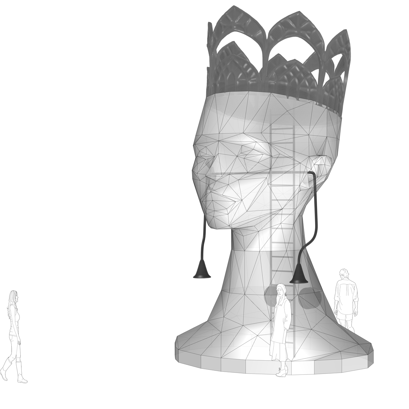 ZARVAN’s ears function as acoustic speaking tubes, creating a direct and intimate channel of communication between individuals standing on opposite sides of the sculpture. Embedded within the ear structures, the tubes operate through a simple mechanical principle, transmitting voice naturally without amplification or electronic mediation.