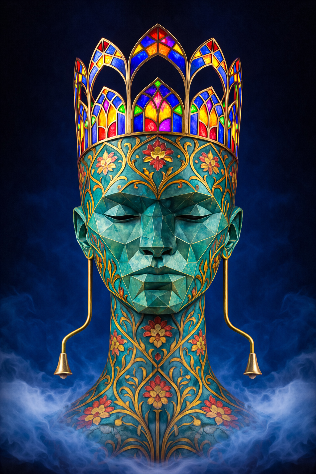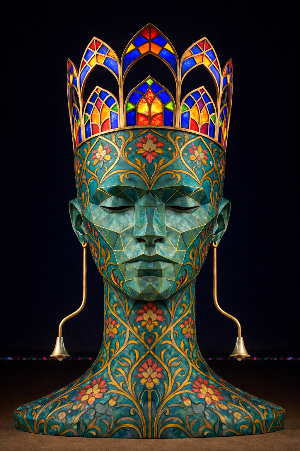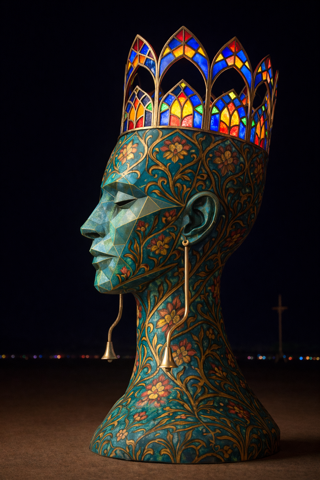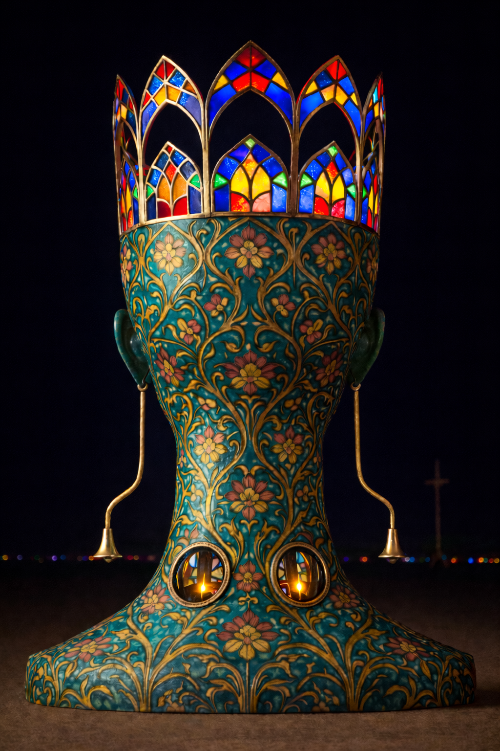 The result is a dialogue between traditional cultural ornament and contemporary industrial fabrication. Persian rug geometry becomes embedded within a faceted steel body, while the stained glass crown opens upward toward light.